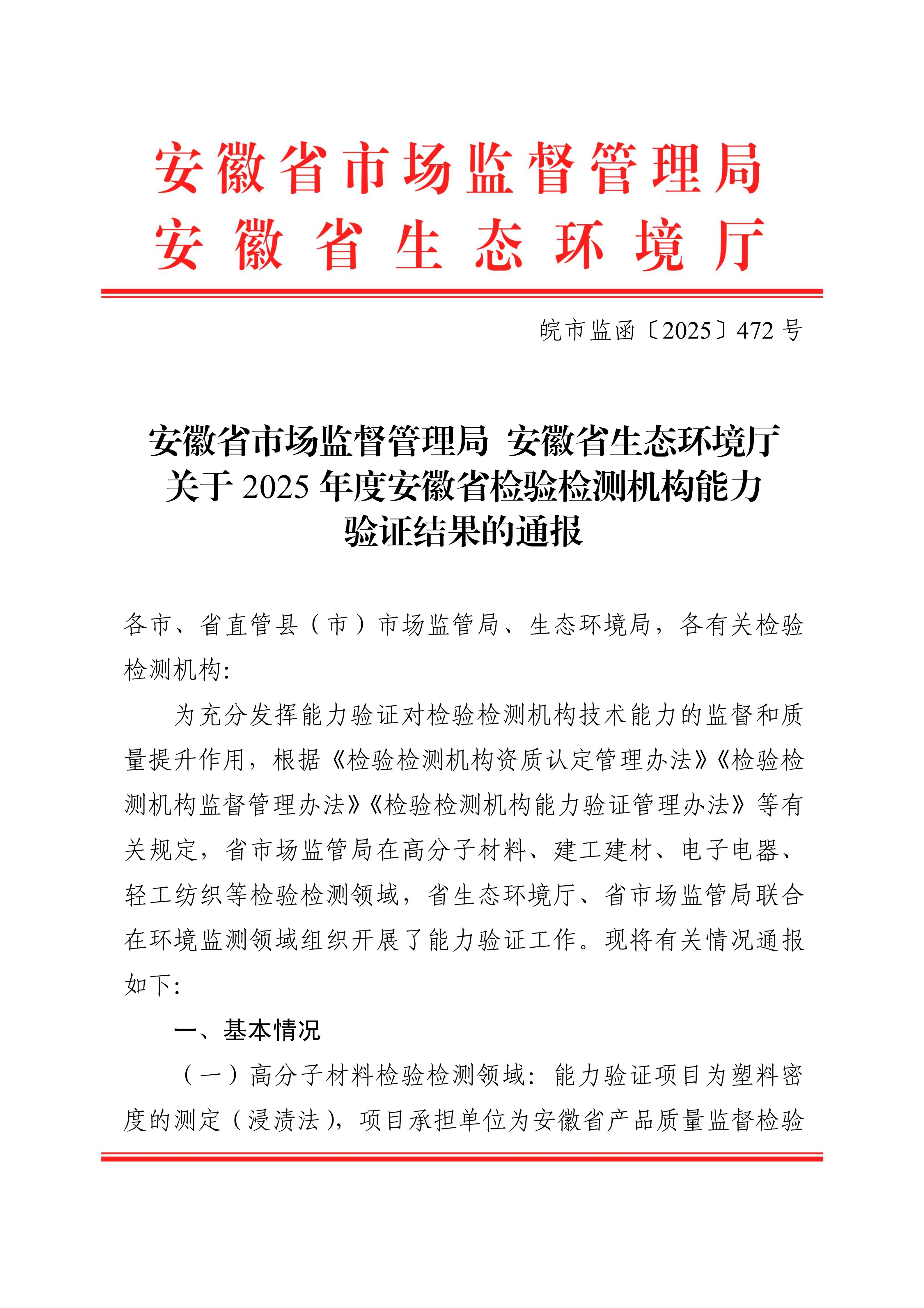 近日,安徽省市場監(jiān)督管理局、安徽省生態(tài)環(huán)境廳聯合發(fā)布了《2025年度安徽省檢驗檢測機構能力驗證結果的通報》。安徽寰宇工程質量檢測有限公司在高分子材料、建工建材兩個檢驗檢測領域的能力驗證中,均取得“合格”結果,充分展現了公司過硬的技術實力和可靠的質量管理能力。 ...